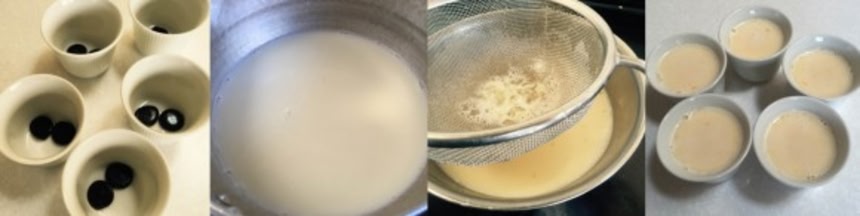 鍋に牛乳、砂糖、バニラエッセンスを入れ、中火にし沸騰しない程度に温めたら火を止め、溶き卵が入ったボウルに少しずつ入れ混ぜ、ザルで2回こす。