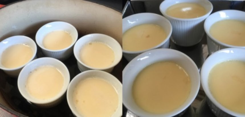 この画像を大きなサイズで見る耐熱カップに静かに注ぎ入れたら鍋に置き、鍋にカップの半分くらいの高さまで水を張り火にかけ、沸騰したら蓋をして弱火に落とし8~10分程加熱したら火を止め、7~8分放置した後取り出す。