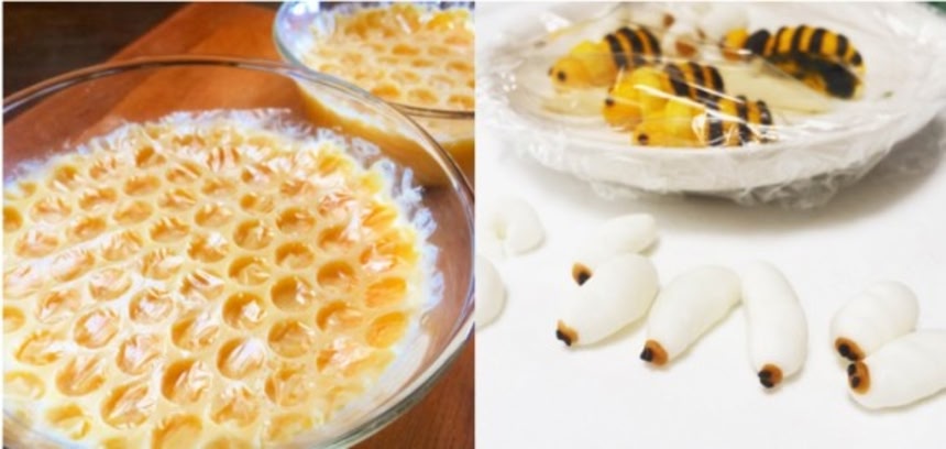 ハチが乗ってる&巣のでこぼこまでならファンシーなのに、蜂の子が入った途端、「ナニコレコワイ」感が一気に増幅されるのが凄い