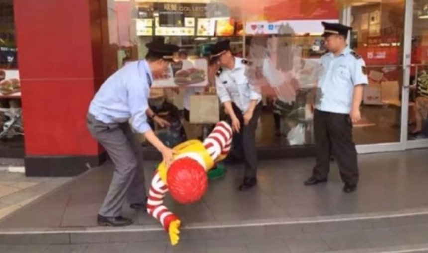 マクドナルドが入っているデパートの警備員によると、ドナルドが“連行”されたのは㋃10日午後だそうで、城管らは、地面に固定されたドナルド人形を荒っぽくもぎ取って行ったという。