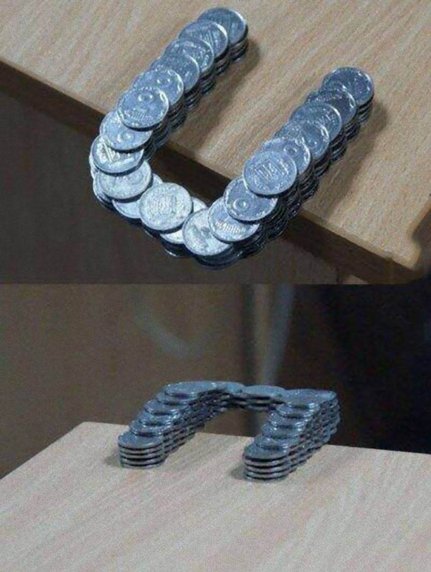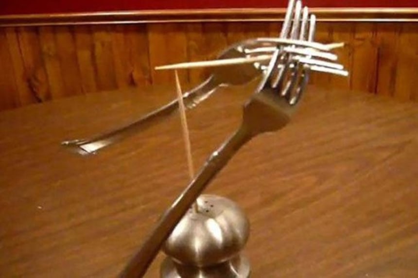 フォークのギザギザを合わせてその間にコインを挟み、コインはコップのふちに置かれてバランスをとっているように見えます。