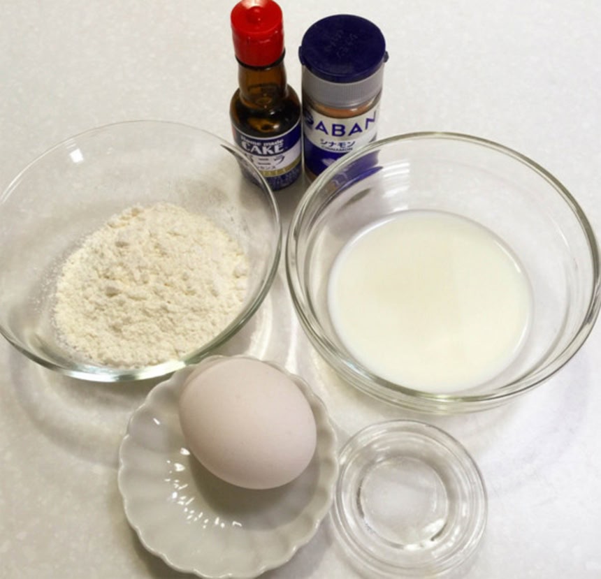 ・別のボウルに牛乳、卵、バニラエッセンスをくわえて泡が立たない程度に混ぜ合わせる。