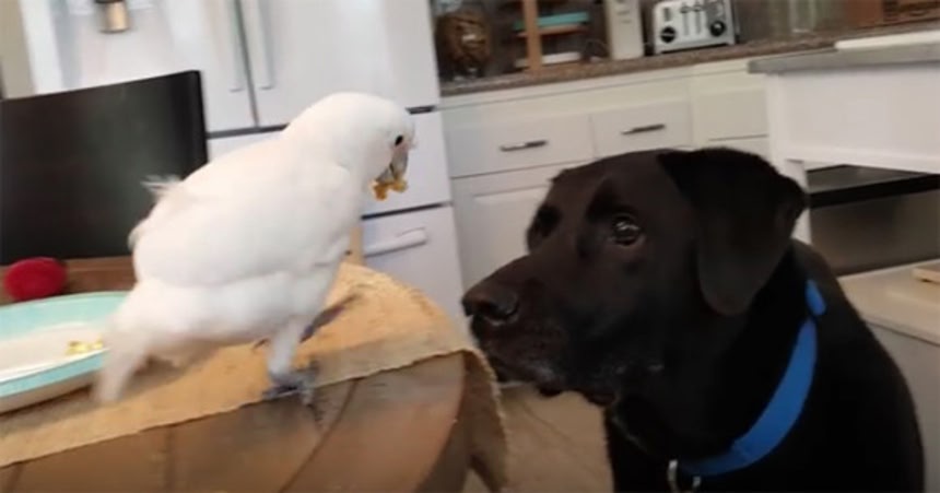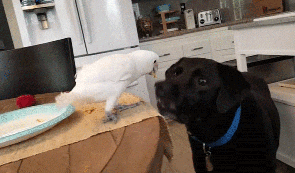 前に別のオウムと犬う動画で、オウムが犬にパスタをあげるやつもあったなあ。