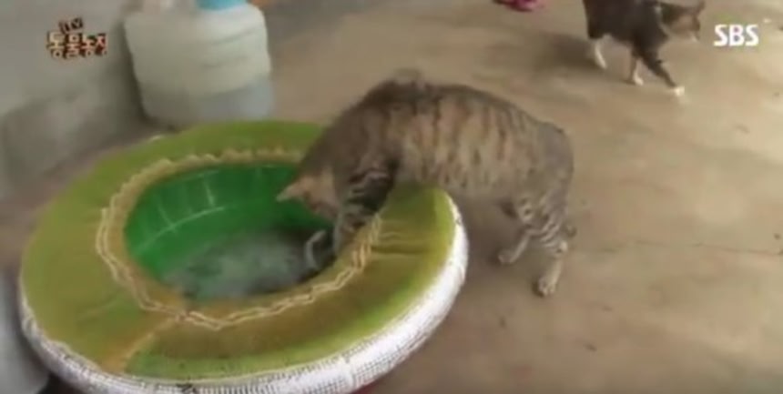 活け造り用の水槽に入れられていたタコ。そのタコを狙うのはそう、ご家庭のミニ捕食獣、猫である。水槽に近づきニュルっとタコを捕獲するまではよかったのだが・・・