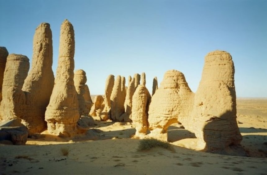 この画像を大きなサイズで見るタッシリ・ナジェールは、アルジェリア南東部、サハラ砂漠にある台地状の山脈である。ニジェールと東のリビアの国境から、西のAmguidまでのおよそ7万2000平方kmに渡るエリアに広がっており、最高点は標高2158mの Adrar Afaoである。何千年にも渡るサハラの気候の変化と浸食のせいで、砂岩の柱や深い峡谷、300以上の自然石のアーチといった目を見張るほどの独特な地形ができあがった。