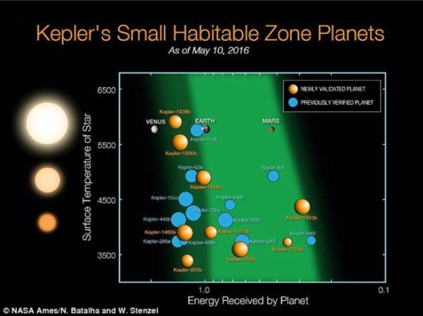 この画像を大きなサイズで見るまた550個が地球のような岩石の惑星である可能性が判明した。そのうち9個はハビタブルゾーンに位置しており、表面温度は水が液体で存在できる範囲に保たれている可能性があるという。これによって、現在知られるハビタブル(居住可能)太陽系外惑星は一気に21個に増えたことになる。
