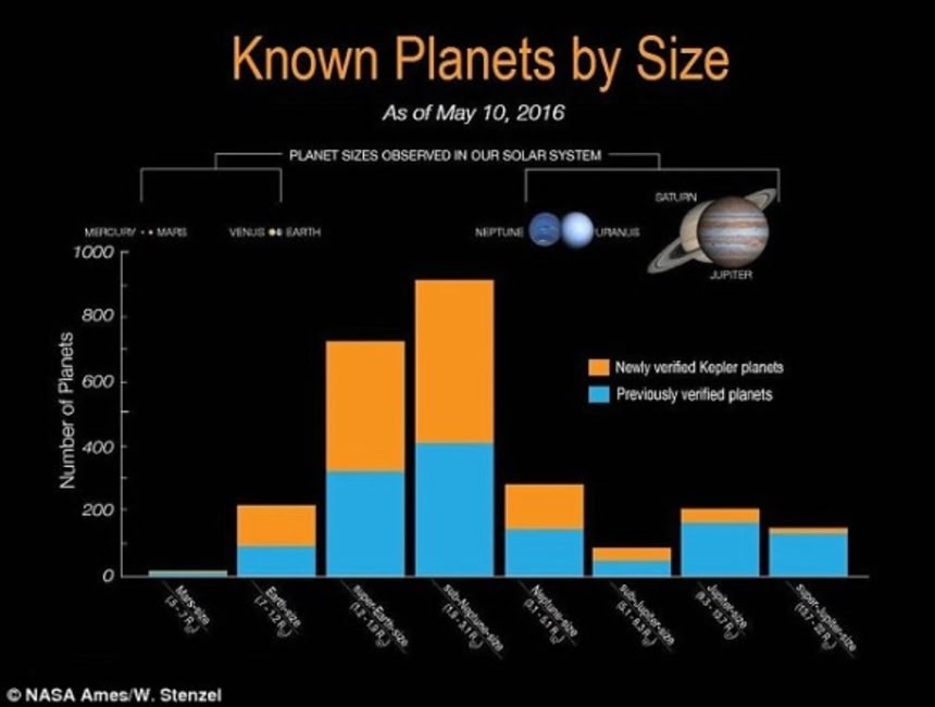 以下の画像は過去20年間で見つかった太陽系外惑星の数。青はケプラー宇宙望遠鏡以外による発見。水色はケプラー宇宙望遠鏡による発見。オレンジは今回発見された数を示す。