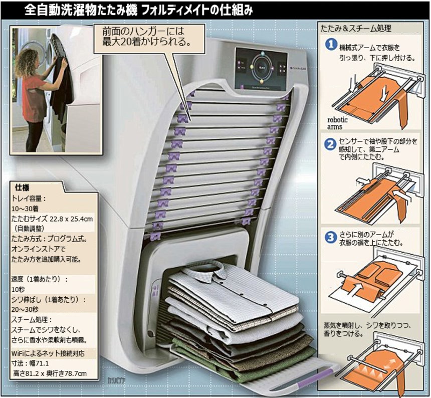 だが、まだまだ途上段階すぎる。 籠に乱雑に放り込んだのがきちんとシワなく畳まれるようになったのが出たら買うよ。 20万くらいでも。