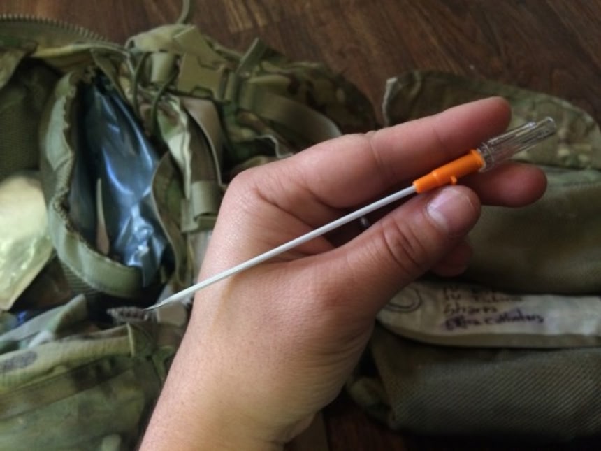 この画像を大きなサイズで見るこれは胸部減圧用の針とカテーテル(NCD)。肺の外側に空気が入ってしまうと、肺が膨らまなくなってしまい、空気が多すぎると肺がつぶれてしまう。チェストシールで胸の傷をすべて塞いで、NCDを刺して余分な空気を抜く。