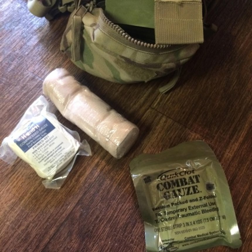 この画像を大きなサイズで見るコンバットガーゼは、止血剤の浸み込んだガーゼで、直接、患部に当てて血液を凝固させる。首に銃撃を受けた場合、コンバットガーゼを傷口に当て、出血がおさまってきたら、あとは普通のガーゼを当てて、伸縮包帯でしっかりとめる。