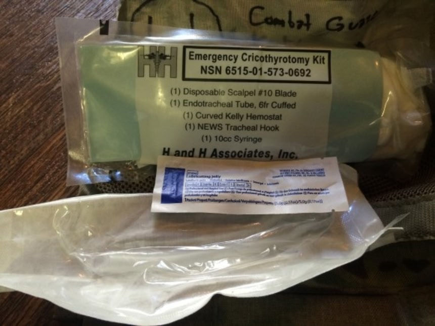 切開用キットは、負傷者の喉に切り込みを入れて気管に直接チューブを差し込むための道具である。