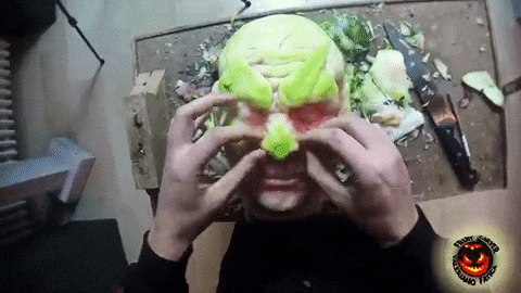 海外の楕円形のスイカがうまいこと頭部にはまったようで、これがスイカ?っというレベルの完成度となった。