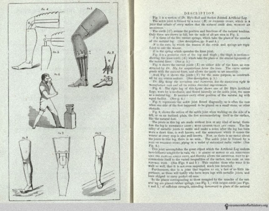 この画像を大きなサイズで見るグラス・ブライの『ニュー・アンド・インポータント・インベンション(new and important invention)』は1859年から1862年までの定期刊行物で宣伝広告をだしていた。象牙で作った球体がゴム製のソケットに置かれている“ボールとソケット足首”は機動性を大幅に改善した」と書かれている。
