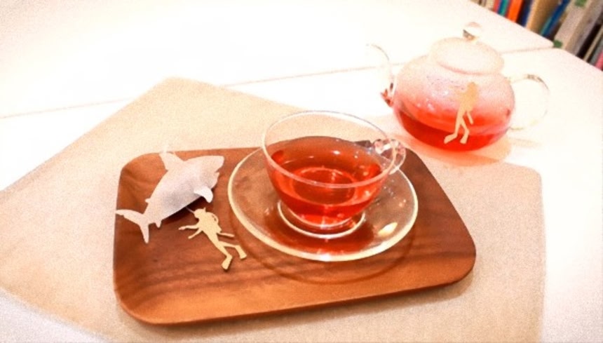 サメ型のティーバッグにお湯を注ぐと真っ赤な血が流れ出るかのように赤いハーブディーが流出するというアイディア商品。この商品は現在クラウドファンディング「makuake」で資金援助を募集中だ。