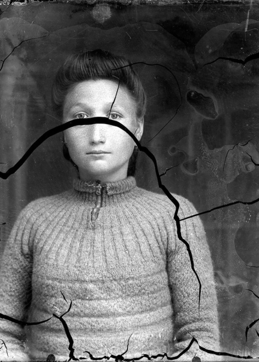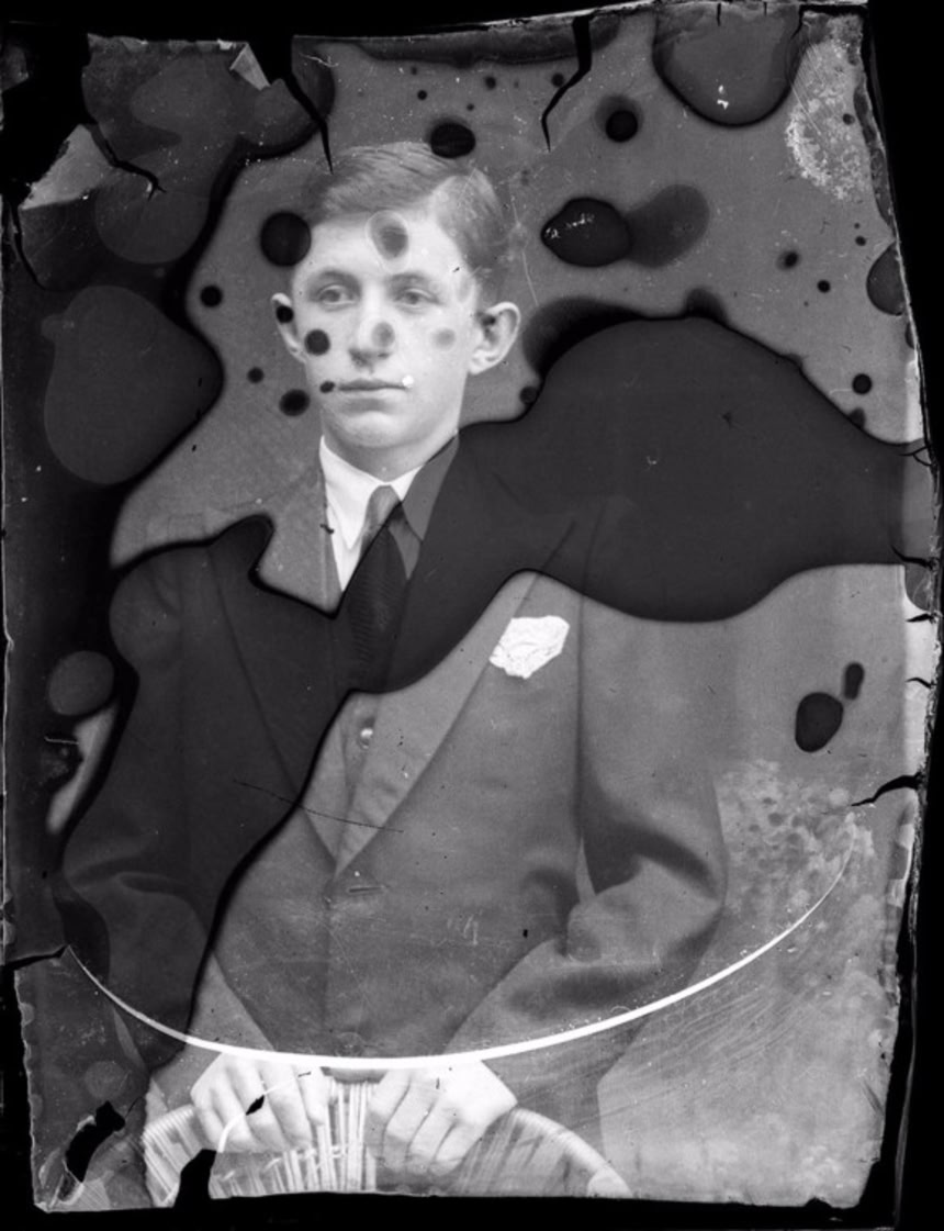 この画像を大きなサイズで見るひび割れ、よじれ、被写体が変形したモノクロの人物写真の数々。これらはルーマニア人の写真家が1900年代半ばに大量に撮影したものの、死後に忘れ去られ放置されたガラスネガ写真の一部だという。
