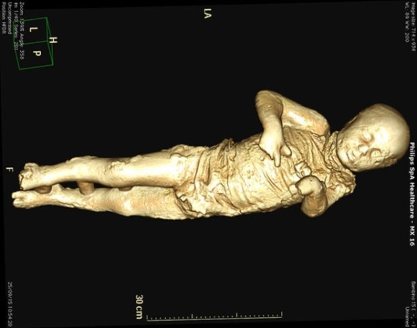 赤ん坊を抱えた母親の隣で見つかった子どもの全身骨格は完全に無傷で残っていて、スキャンによって彼は2~3歳の幼児で、これまで衣服の結び目だと思われていた胸のでっぱりは、実はゴールドの留め金であることが判明した。