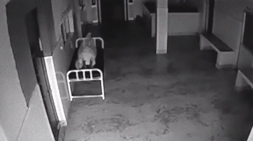 病院の通路で白い布を全身にかけられた女性の死体がベッドの上で横たわっている。