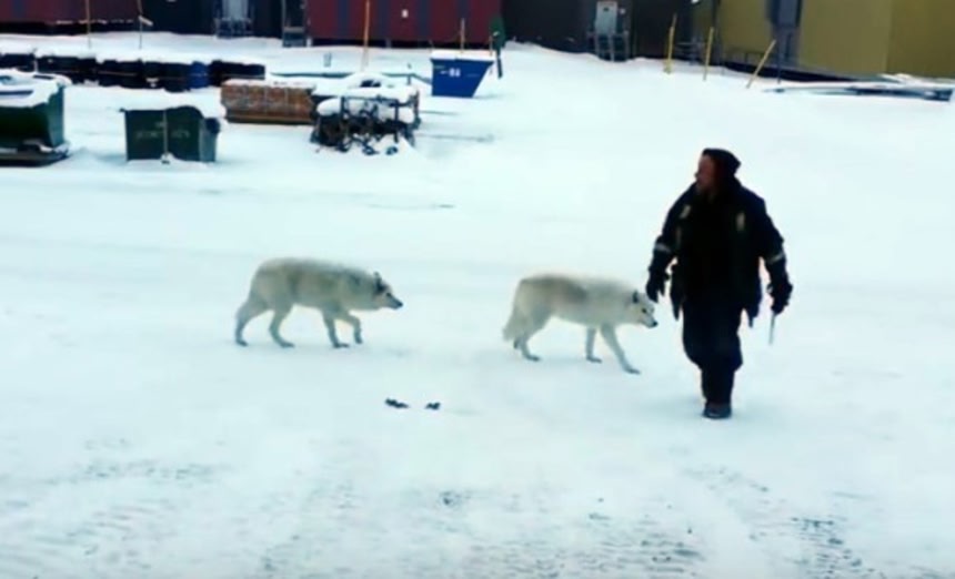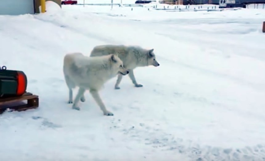 この画像を大きなサイズで見る北極の近く、北極圏にある基地にて、野生のホッキョクオオカミが基地のそばにやってきた。いろんなものをクンクンと物色しながら徐々にその距離を縮めていく。