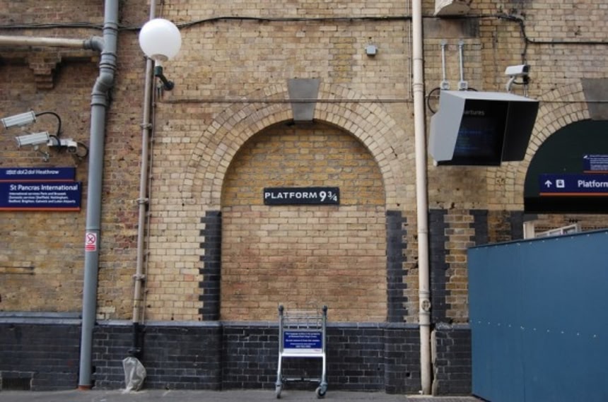 ロンドンにあるキングスクロス駅は、この大ベストセラー本のロケ地に使われたことを祝って、実際のホームの端に9と3/4番線の標識をつけている。標識の下には、魔法の壁を通り抜けて今にも向こう側へ消えていくように見える荷物ワゴンがある。マグルにとっては、この壁は固いレンガのままなので、突っ込んでみるような真似はしないよう、ハリポタファンに警告されている。