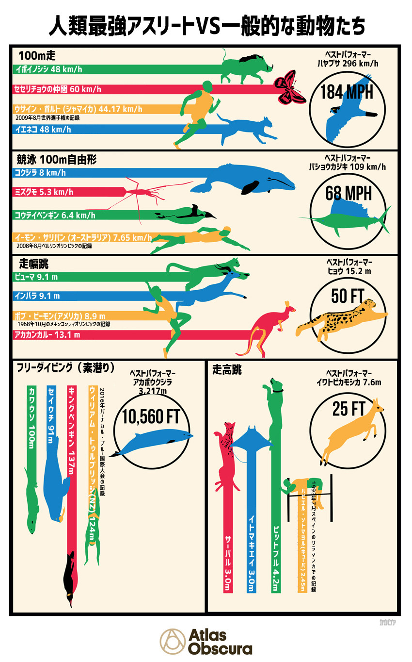 尚、調べてみたところ、動物たちと比較しているトップアスリートの記録はそれが最高記録であるとは限らないようだ。今年のリオオリンピックの記録は含まれていないらしい。