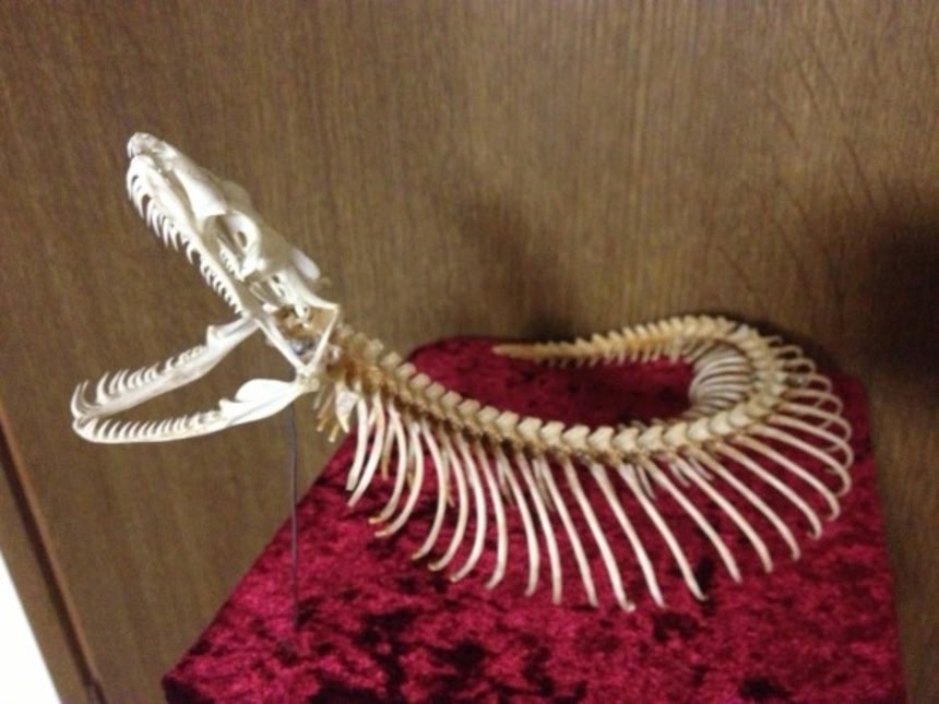製作者の骨オヤジさんは様々な依頼を受け、様々な作品を作り上げている。こちらは「ツチノコ」。新宿ロフトで開催された毒蛇トークイベントで「ツチノコの骨格はどうなっているのか?」というテーマで依頼されたもので、マツカサトカゲとボアコンストリクターの頭を組み合わせて作ったそうだ。