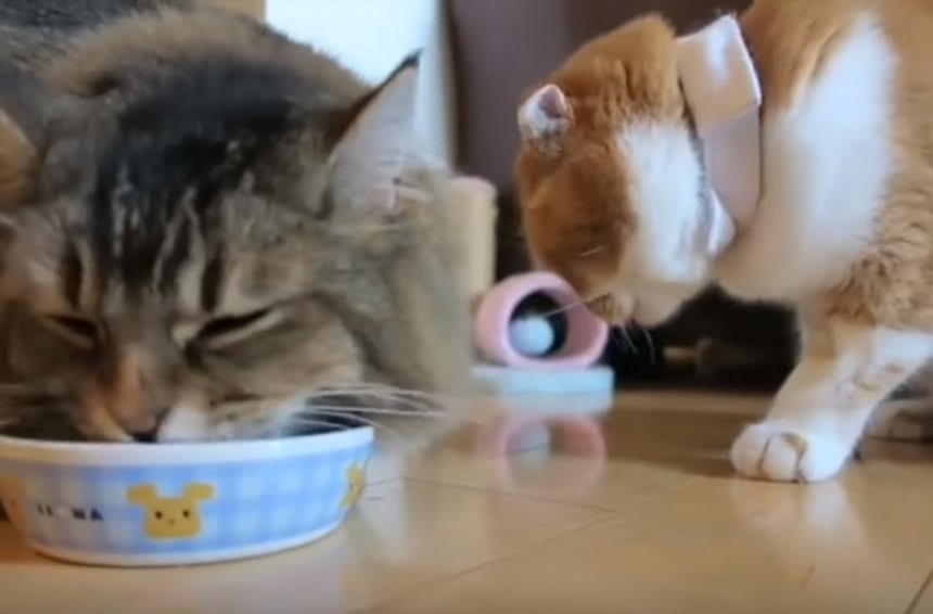 うちは多頭飼いでフードボウルは頭数用意してあるけど、この動画みたいな事が起こるよ。