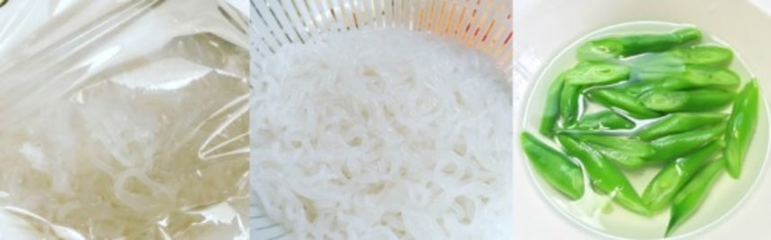・しらたきはサッと塩で揉んで耐熱皿に入れてお湯を入れ、レンジ500wで1分程温めてザルにあげておく。