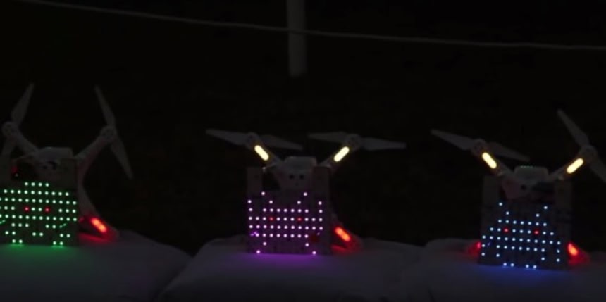 この画像を大きなサイズで見る実際のドローンを使用したインベーダー。チームを率いたトーマー・ダニエル氏は複数のドローンを同調させるプログラミングを制作したとのこと。