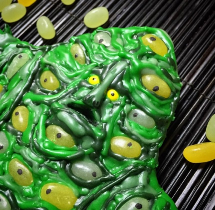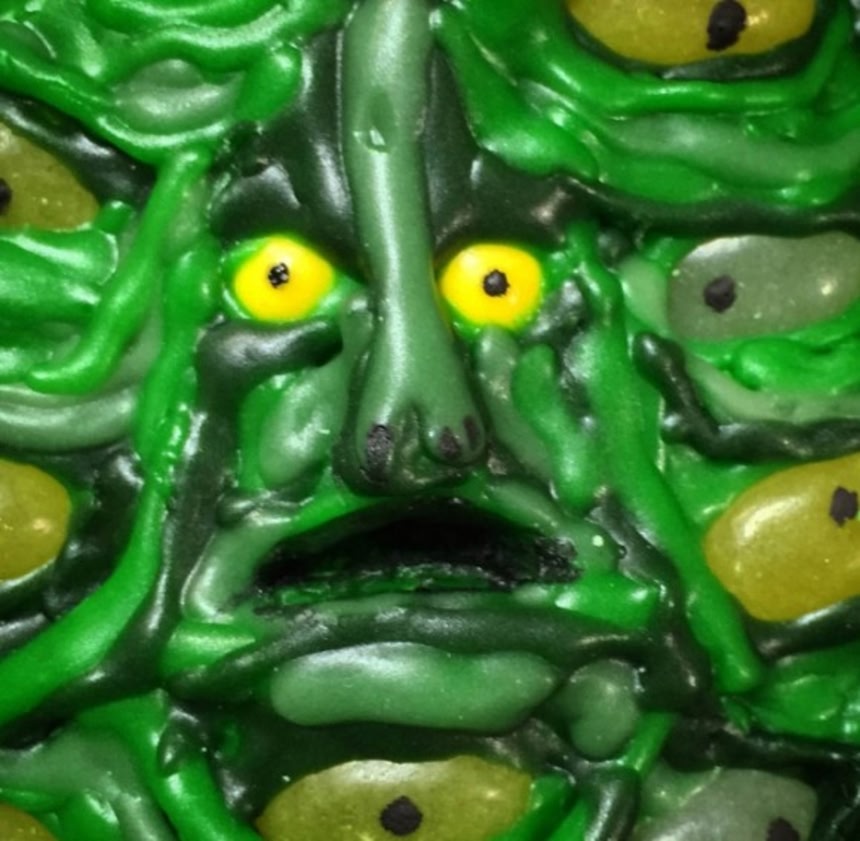この画像を大きなサイズで見るクッキーに緑色色素を加え、グミキャンディー「ポイフル」を目玉に使用。アイシングに色を付けてデコレーションして完成だ。