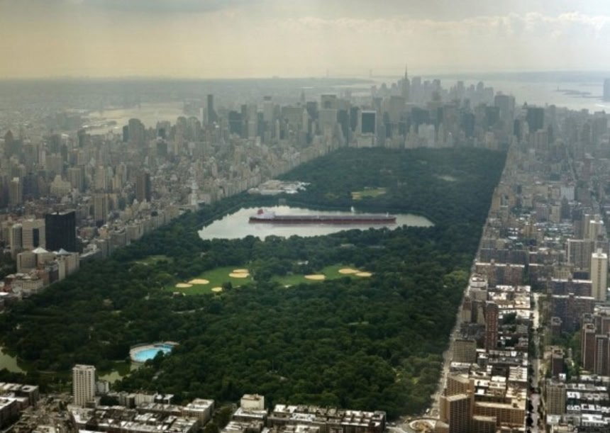 この画像を大きなサイズで見る全長およそ458mの巨大な石油タンカー「ノック・ネヴィス」を米ニューヨークのセントラルパーク内の大きな人工湖に浮かべてみた。湖の余裕は前後100mほどしか残らないという。