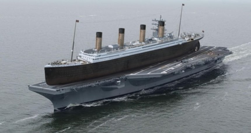 >アメリカ海軍の航空母艦、ロナルド・レーガンにタイタニック号を乗せてみると