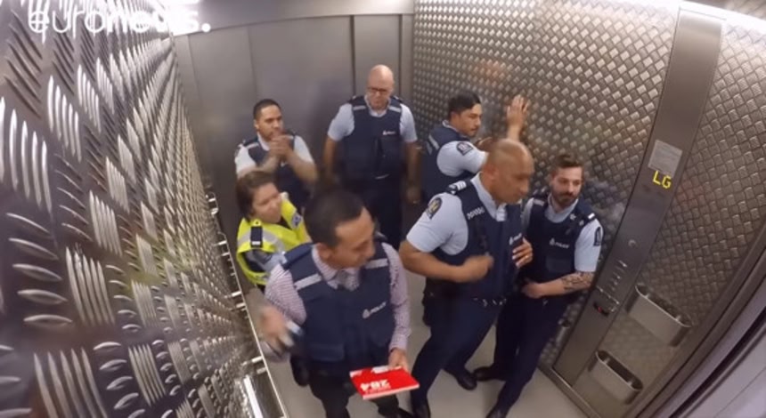 ニュージーランドの警察署内のエレベーターに設置された監視カメラが、日々緊迫した事件に翻弄される警察官たちの決して外部では見られない、お茶目な様子をとらえていたようだ。それは警官のみならず重役までも巻き込んでのちょっとしたサプライズなのである。