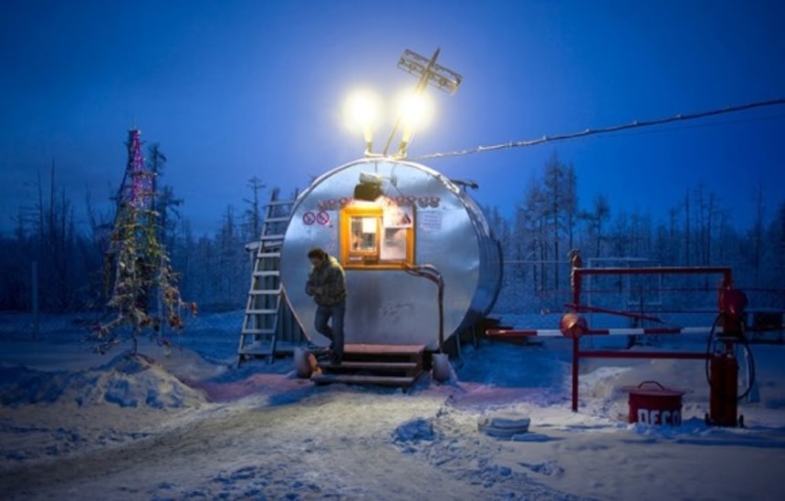 この画像を大きなサイズで見るオイミャコンにわずかしかないガソリンスタンドは住民の生命線になっている。労働者は2週間働いて、2週間は休みだ。