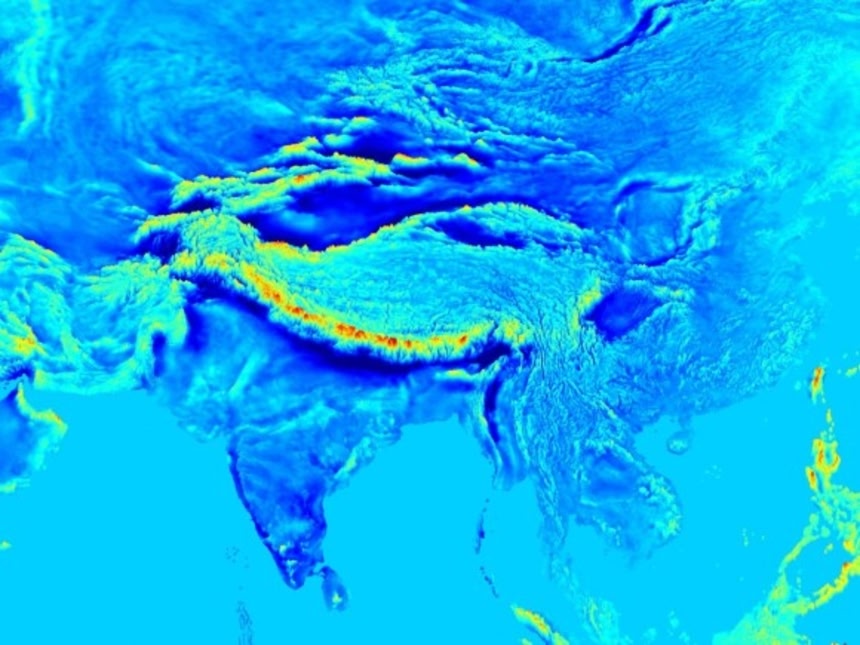 この画像を大きなサイズで見るやや不完全だが、インドが大陸に衝突しているヒマラヤ山脈でくっきりと重力が色づいているのがわかる。