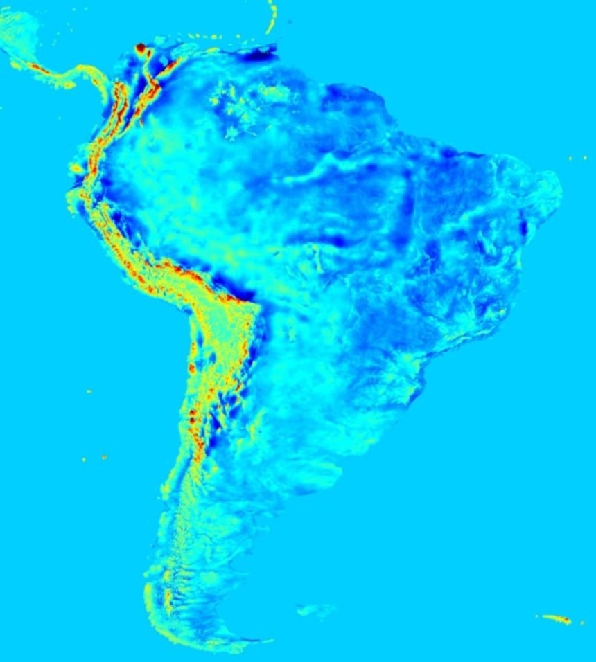 この画像を大きなサイズで見るアンデスや東部の高地で重力が強い。弱いのはブラジル西部に広がる平地だ。