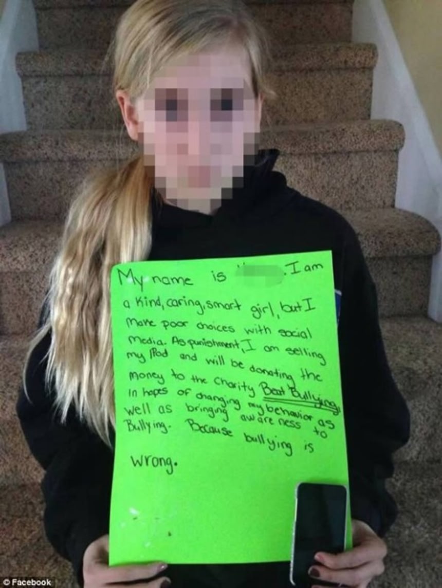 この画像を大きなサイズで見るネットいじめをした娘に罰を与えるため、母親がフェイスブックに写真を投稿した。その写真には、「わたしは”SNAを悪用した間違った行い”をしたため、罰としてスマホを売り飛ばすはめになり、そのお金をいじめ撲滅のためのチャリティに寄付します」と説明した紙を持っている娘が写っている。