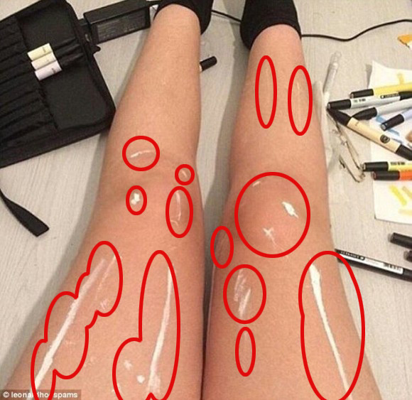 この写真、実は生足に白い絵の具を立体的に見えるような配置で塗っているんだ。下の画像をクリックするとどのように塗っているのかがわかるよ。