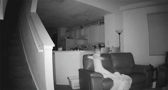 この画像を大きなサイズで見るアメリカ、フロリダ州タンバにあるご家庭のセキュリティカメラがとらえた映像だ。時刻は午前2時頃、白い影がソファに乗り、激しくリビングを動き回っている。