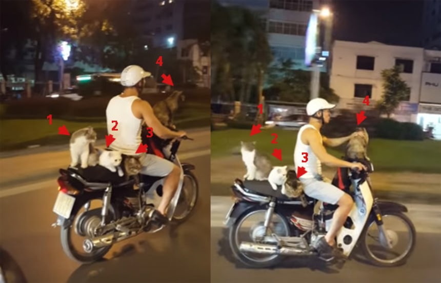ベトナム、ハノイで目撃例が多発しているという猫4匹を乗せて走るバイク。定員オーバーだし猫が逃げたらどうすんの!っとドキドキの展開なのだが、猫たちはおとなしくバイクに乗っているのがミラクル。