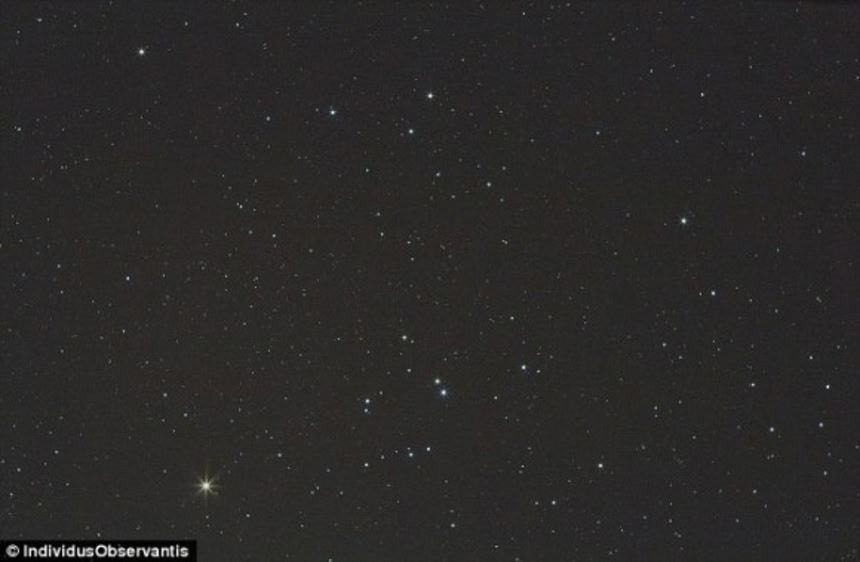 この画像を大きなサイズで見る15日夕方から16日明け方、おうし座の目の場所に月が昇る。普段おうし座の目にあたる部分にある星は、地球から67光年離れたこの星座の中でもっとも明るい星アルデバランである。これが月によって隠される。