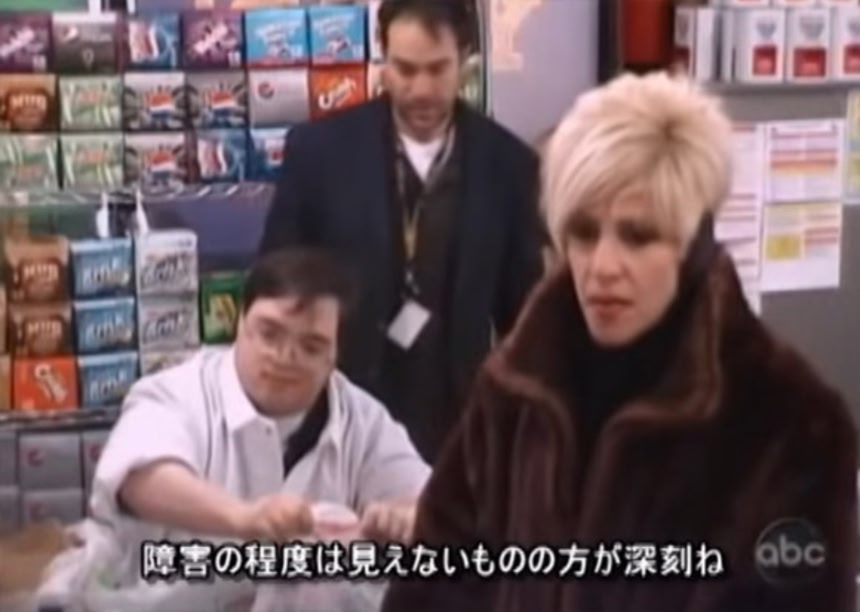 この画像を大きなサイズで見るカラパイアのコメント欄で是非取り上げて欲しいと言われた映像がある。これは、アメリカABC放送が行った社会実験で、現在俳優として活躍しているダウン症候群の男性ジョシュの協力を得て、スーパーのレジ係をやってもらい、更に女性、若い男性、年配の男性の演者にジョシュのことを罵る役をやってもらった。