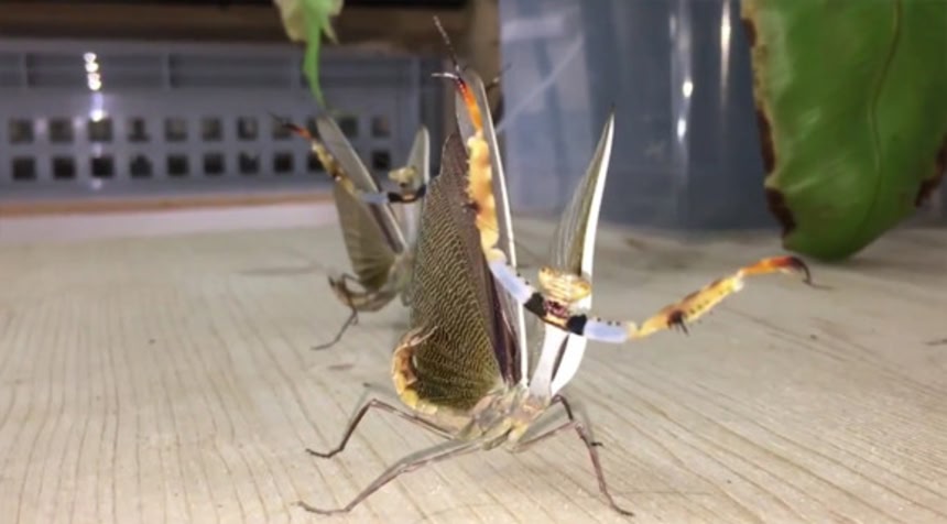 アフリカのケニア、タンザニアなどに生息する和名尻上げカマキリ(Parasphendale)の臨戦態勢がものすごくかっこよかった。2匹並んで戦闘力アップ。やんのかごるぁ!と人間を相手に立ち向かっていくのである。