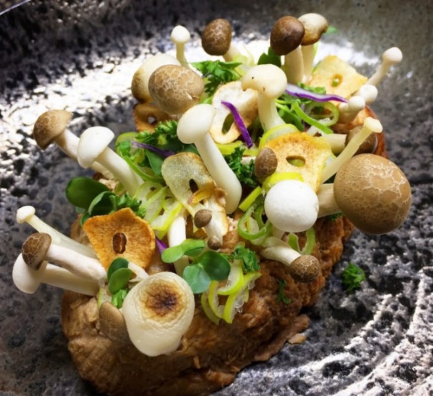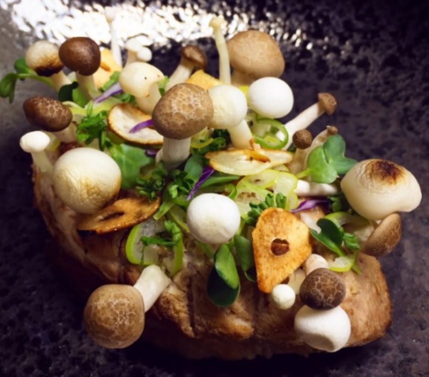 焼き豚にナイフで切れ目を入れて菌類を刺していき、最後に葉物やさっと焼いたニンニクスライスで飾り付けたら出来上がり!
