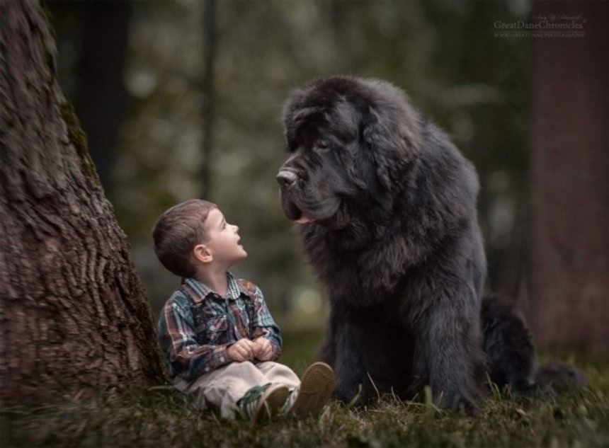グレートデーンやニューファンドランドなどの大型犬と幼い子どもが極端な体格差をものともせずに楽し気に過ごしている写真はソーシャルメディアでも人気を博している。