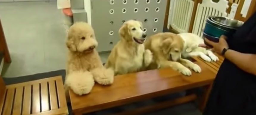 海外では「マネキンチャレンジ」というのだが、動かざることマネキンのごとしな状態を保つこの芸。訓練された犬たちはそれを団体でやってのけた。