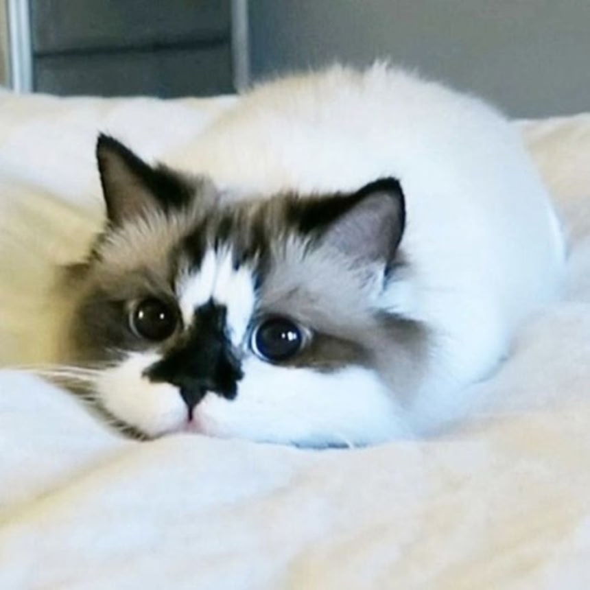 この画像を大きなサイズで見る吸い込まれるような澄んだ青い瞳、もっふもふの美しい毛並み。だがそれだけではない。鼻の部分にユニークな柄を持つマンチカンが圧倒的にクールだとして話題になっている。