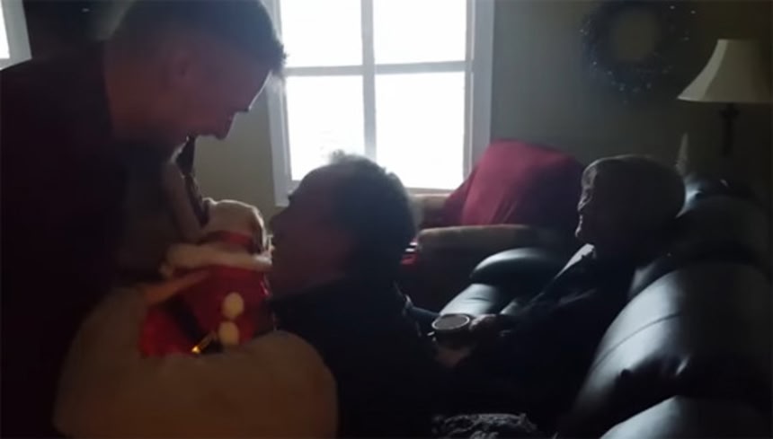 お父さんに手渡されたのは、サンタの衣装を身にまとった子犬!