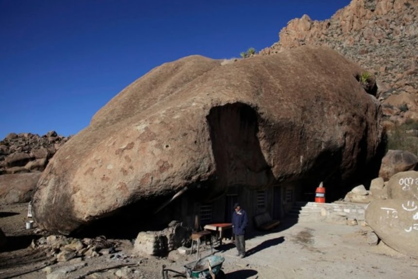 この画像を大きなサイズで見るメキシコ北部のコアウイラ州サン・ホセ・デ・ラス・ピエドラス近くにある自宅の外に立つベニート・ヘルナンデス。妻のサンタ・マーサ・デ・ラ・クルーズ・ヴィラリアルと家族もこの奇妙な家に住んでいる。家は日干し煉瓦でできているが、直径40メートルの岩が屋根になっている。(2013年1月16日撮影)