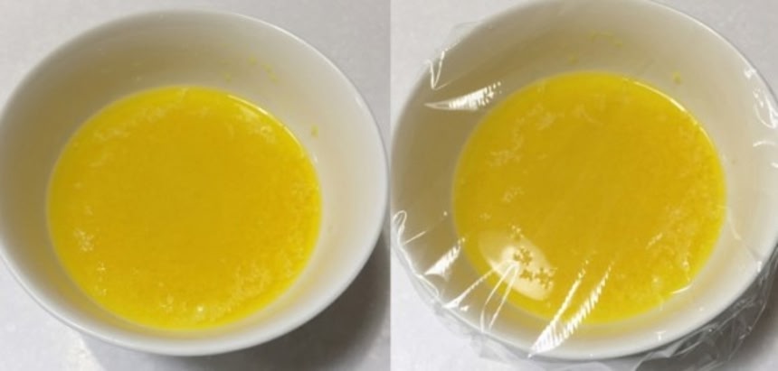 再び材料を混ぜ、ラップをかけて10分蒸らす