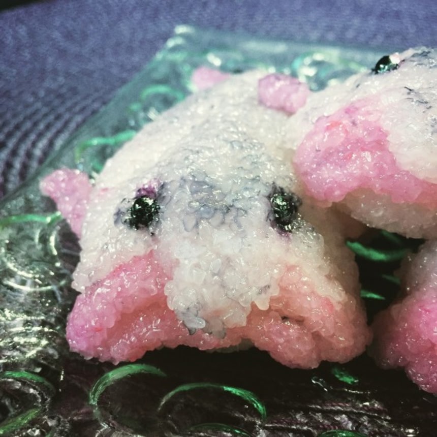 生地の作り方や材料、分量はヒヨコ餅と一緒。装飾には、食用ピンク色素、食用黒色素を使用。目の部分はアラザンのピンクシルバー、5mmサイズを使用している。